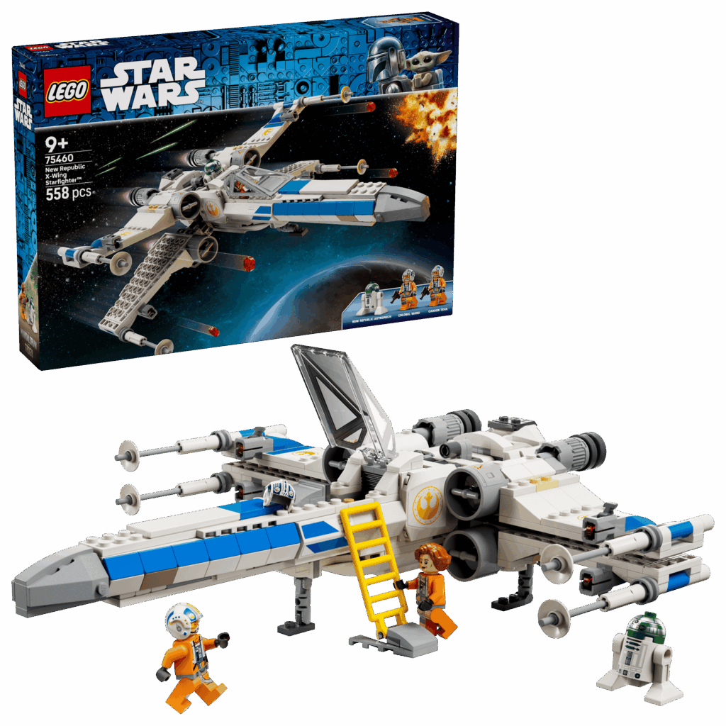 Der klassische X-Wing kehrt zurück – dieses Mal im Neuen Republik-Design. Er hat bewegliche Flügel im Attack-Mode-Look, einen aufklappbaren Cockpit-Bereich, Shooter und eine typische Farbgebung, die sich klar von früheren Versionen abhebt.